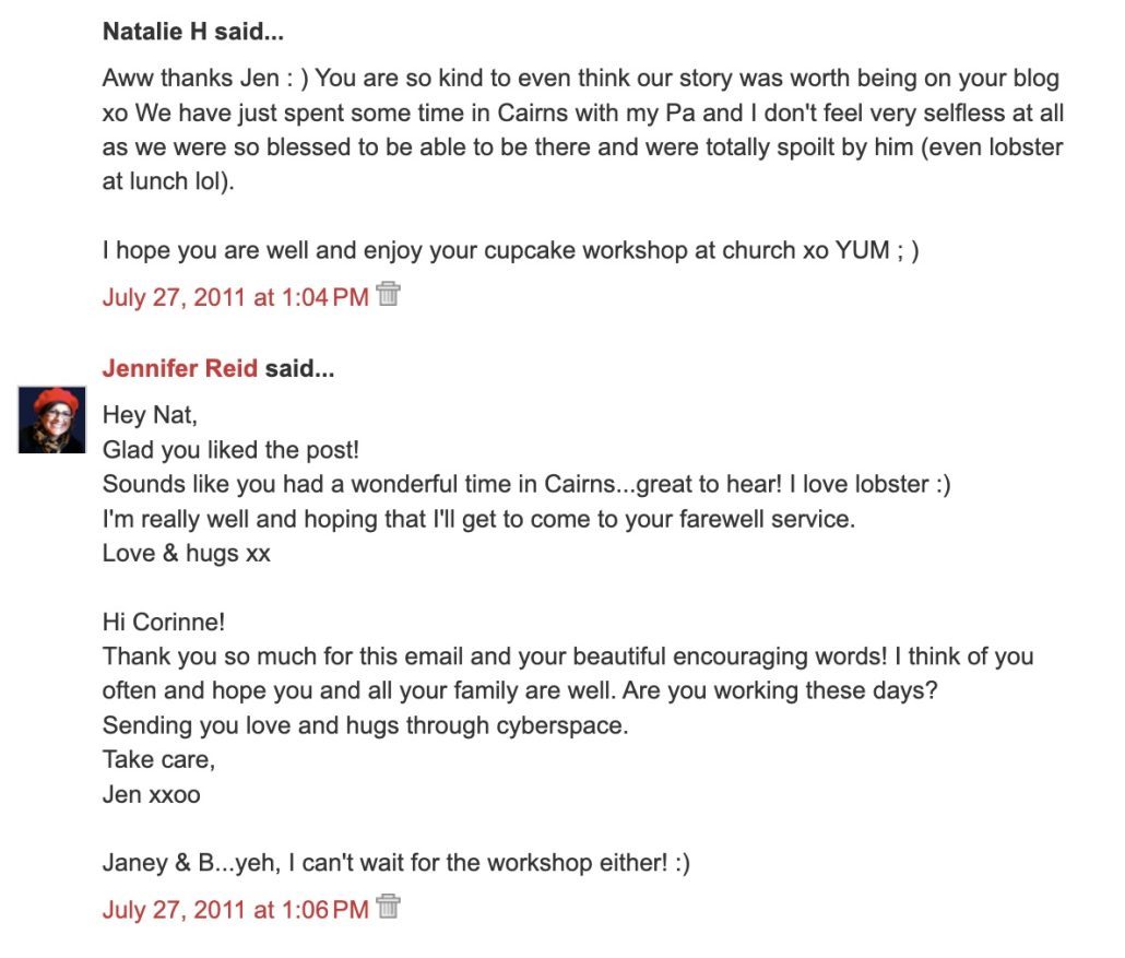 Early in 2011 my mum started making cupcakes for her church to sell each Sunday as a fund raiser for their Connect Lunch, which is a free lunch they do each month as an outreach.  They bring unsaved people in and give them a free meal in an accepting atmosphere.  I see this lunch as a great example of a church being the hands, feet and heart of Jesus.  I have been told by some at the church that the lunch has been a major contributing factor to the growth of the church – apparently the church has nearly doubled in size since the lunches began!