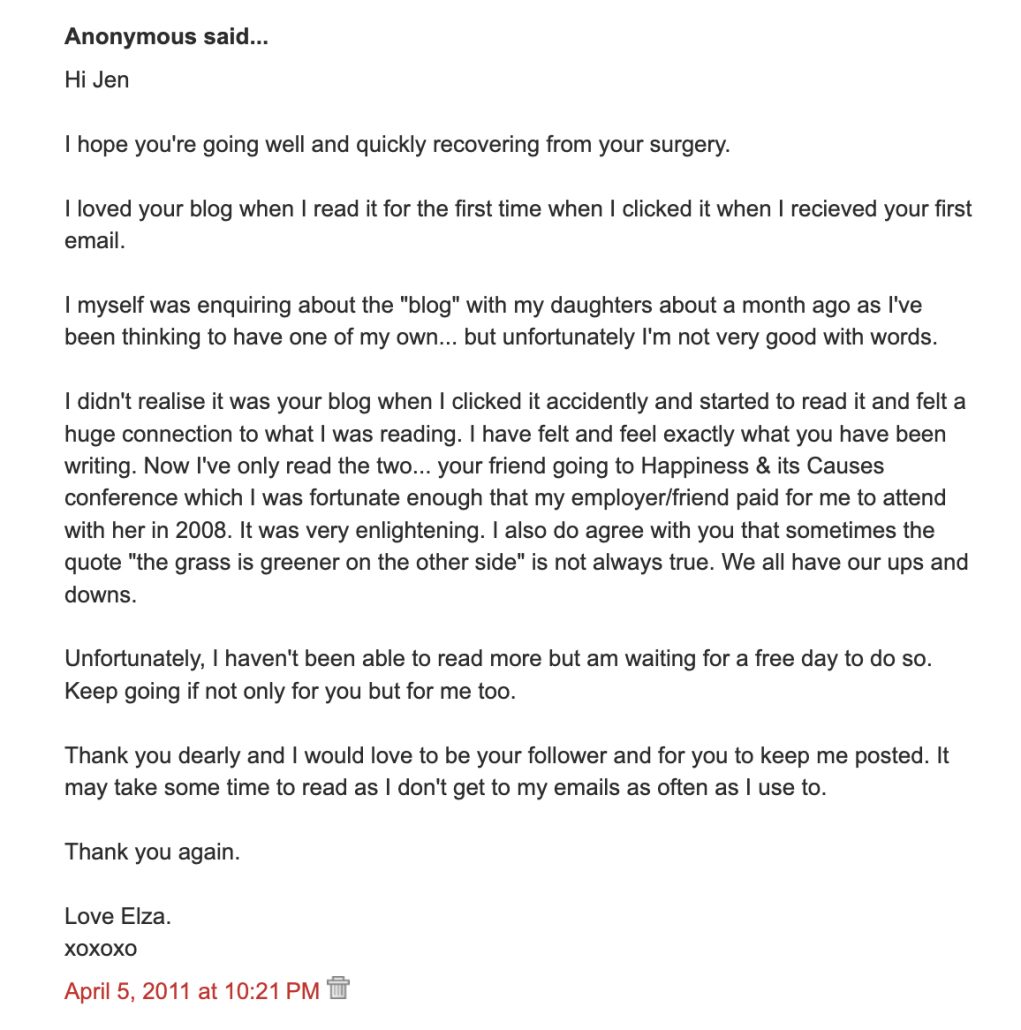 These were my loved ones, my motivators, my encouragers, my personal trainers, who cheered me on when I thought I couldn’t go another step; who nurtured me when I felt hopeless; who prayed for me when I was too weak to pray for myself; who remembered the Jen I was before I got sick; who told me I was beautiful in spite of how ugly I felt; who held my hand or hugged me when I was too sick to talk; who visited me even when I was not much fun to be around; and who never lost confidence that I would soon be a new and improved version of my old self again!