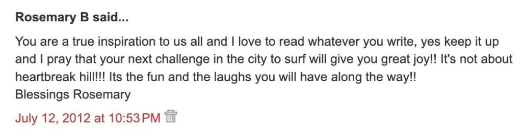 I must admit, I’m not looking forward to the notorious “heartbreak hill” that everybody’s warning me about, but I am looking forward to being with my Team Pink girls again…I’m also excited about reaching my $20,000 target with your help!
