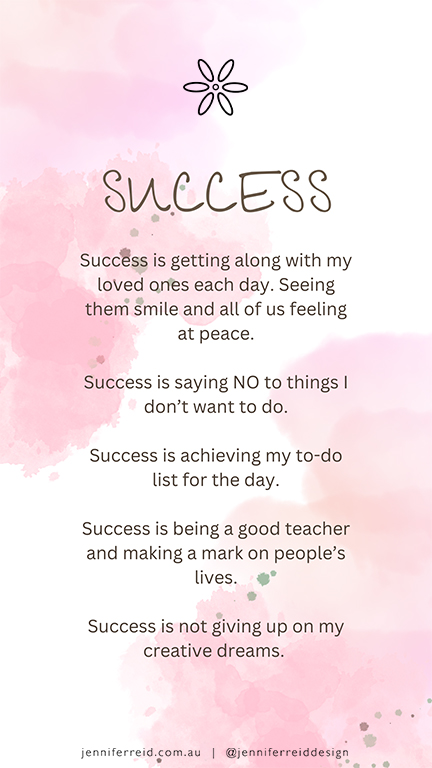 So my aim is to always try to focus on my own goals and celebrate my own successes, rather than comparing myself to others. I’m slowly getting through a great book called The Life Plan by Shannah Kennedy and one of the tasks was to figure out what success actually means to me. This is what I came up with and I created an image to keep on my phone as a screensaver/daily reminder. What does success mean to you?